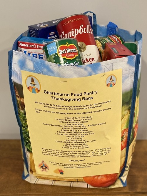 Again this year, we will be filing bags of nonperishable items for Thanksgiving for the families served by Sherbourne Food Pantry. Last year, we met our goal of providing 100 bags and would like to provide the same number this year.