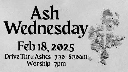 Ash Wednesday begins the season of Lent - a time where we prepare for Easter. This is a solemn day that reminds us of our human mortality by the practice of "imposing" ashes (often made from burnt palms from the prior year's Palm Sunday branches) onto the forehead. We offer two opportunities to observe this important day in the life of the church: "Drive Thru" ashes and a worship service.